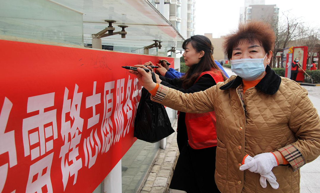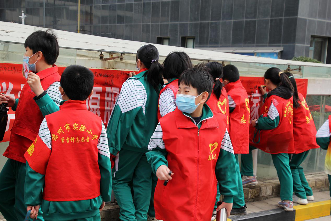 统一着志愿者红马甲的社区党员、家长、学生们及物业工作人员共同栽种白蜡树。