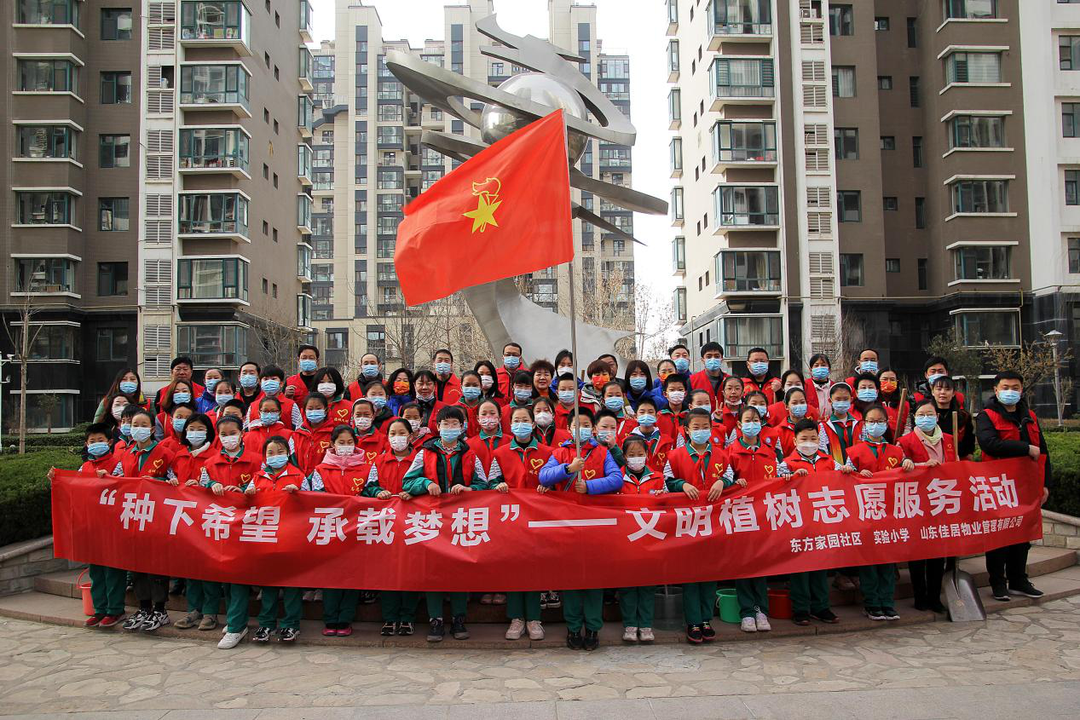 而后进行条幅签字、合影。条幅内容:“种下希望 承载梦想----文明植树志愿服务活动 东方家园社区 山东佳居物业管理有限公司 实验小学”。
